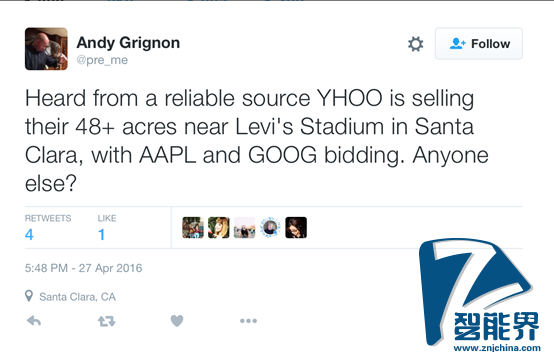 日前,美國媒體報道證實,雅虎正在出售名下位于硅谷圣克拉拉市一塊48英畝的土地。昨日,知情人通過Facebook曝光了該交易的最新進(jìn)展,多家互聯(lián)網(wǎng)和科技公司加入了對這塊土地的競購,其中包括谷歌、蘋果這樣的互聯(lián)網(wǎng)巨頭。