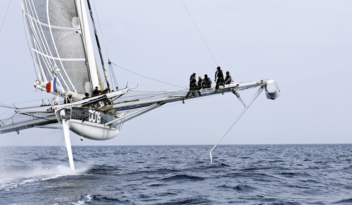 Alain Thebault設(shè)計(jì)的Hydroptere是一種高速航行時(shí)靠艇體下部所裝水翼產(chǎn)生水動(dòng)升力并將船體托出水面航行的船型。由于最大限度地減少了水對(duì)船本身帶來(lái)的阻力,所以水翼船往往能獲得極高的速度,看起來(lái),就像是在水上飛翔一樣。